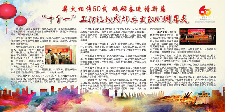一次慶典大會:9月28日下午2:30-3:30,慶典大會將在成都金牛賓館舉行。我隊全體干部職工、離退休老同志等將共同回顧成都水文隊60周年的發(fā)展脈絡,見證全隊上下團結一心開啟嶄新的時代。