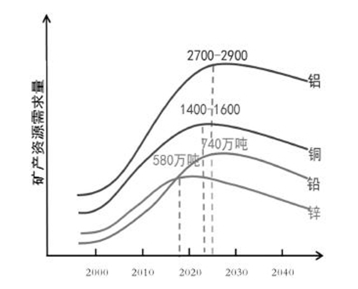 王安建教授預(yù)測,達到峰值的礦產(chǎn)需求總量會很高。預(yù)計鋼鐵消費的峰值大致是在7億噸~7.5億噸;能源消費的峰值大約出現(xiàn)在2030年,大約消費40~42億噸;我國銅的消費峰值大致在2022~2025年,大約消費1300萬噸~1500萬噸;鋁的消費峰值大致在2022~2025年, 消費2700萬噸~2900萬噸;鉛、鋅的消費峰值大致在2022年左右,鉛大約消費680萬噸~700萬噸,鋅大約消費770萬噸~790萬噸。